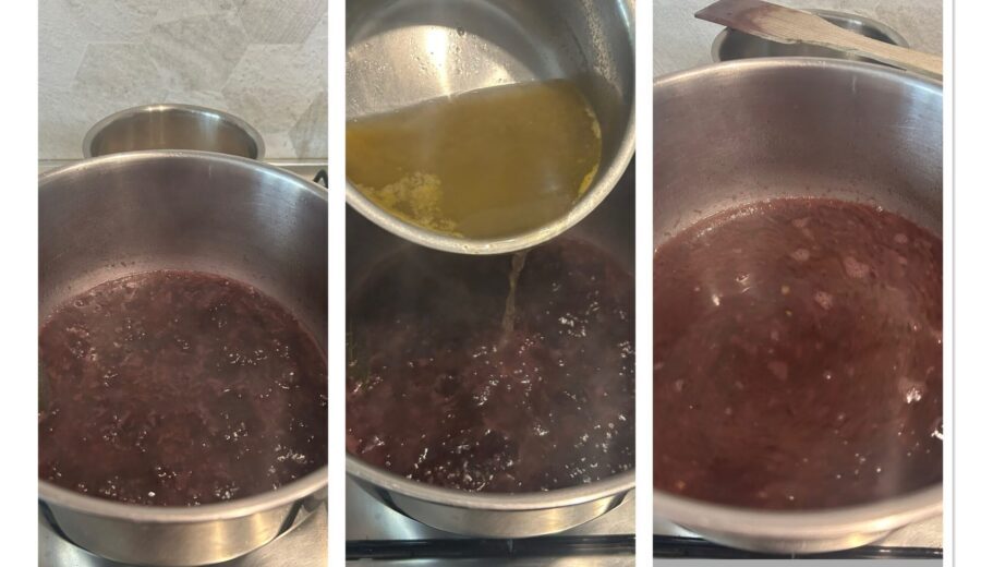 Quando o vinho tiver reduzido mais de 2/3 do volume total, adicione o caldo e deixe reduzir novamente; no final você deve obter cerca de 300 ml de parte líquida.