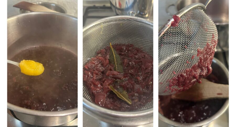 Adicione o mel ou o açúcar, uma ou duas colheres de chá, dependendo de quão ácido ficou o resultado, e ajuste o sal se necessário. Coe a mistura com uma peneira e pressione um pouco, como para peneirar as partes que restaram; você deve obter algo como um purê de cebola — recolha isso e junte à redução.