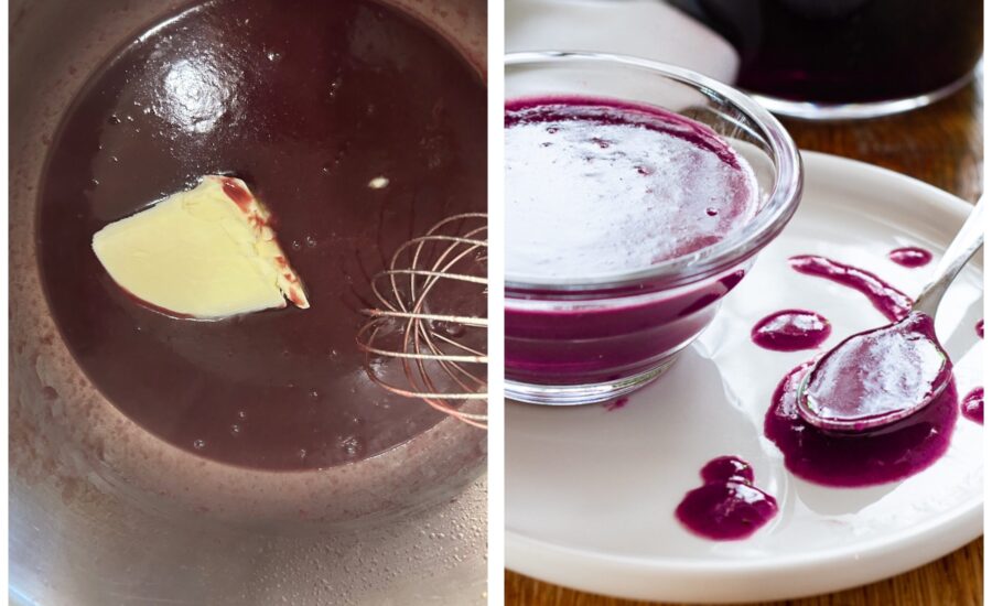 Deixe engrossar em fogo baixo, desligue o fogão, junte o restante da manteiga e mexa até obter um molho brilhante. A redução de vinho tinto está pronta para uso — eu gosto de misturá‑la a um fondo brun para um sabor mais intenso.