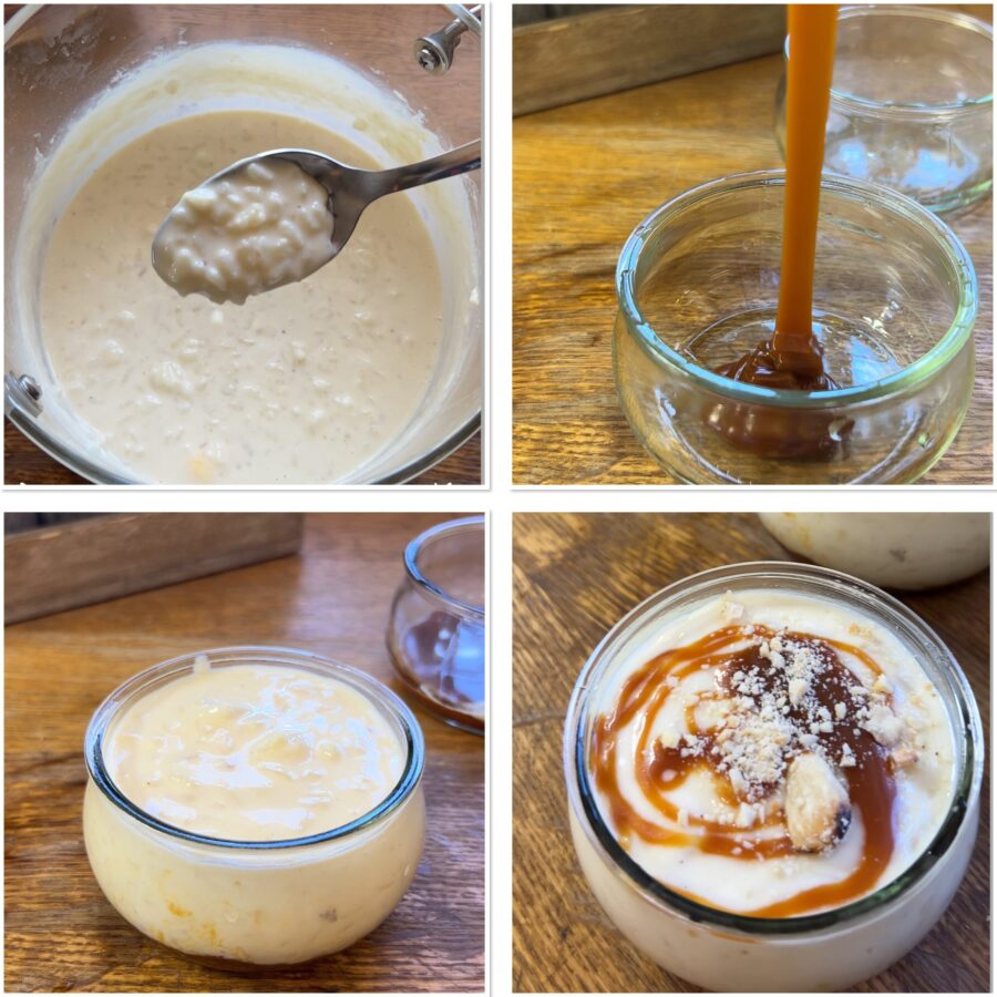 • Pegue 4 copos, coloque em cada um uma ou duas colheres da calda de caramelo sem creme de leite e encha com o creme de arroz. Cubra, se gostar, com mais caramelo e lascas de frutas secas.
