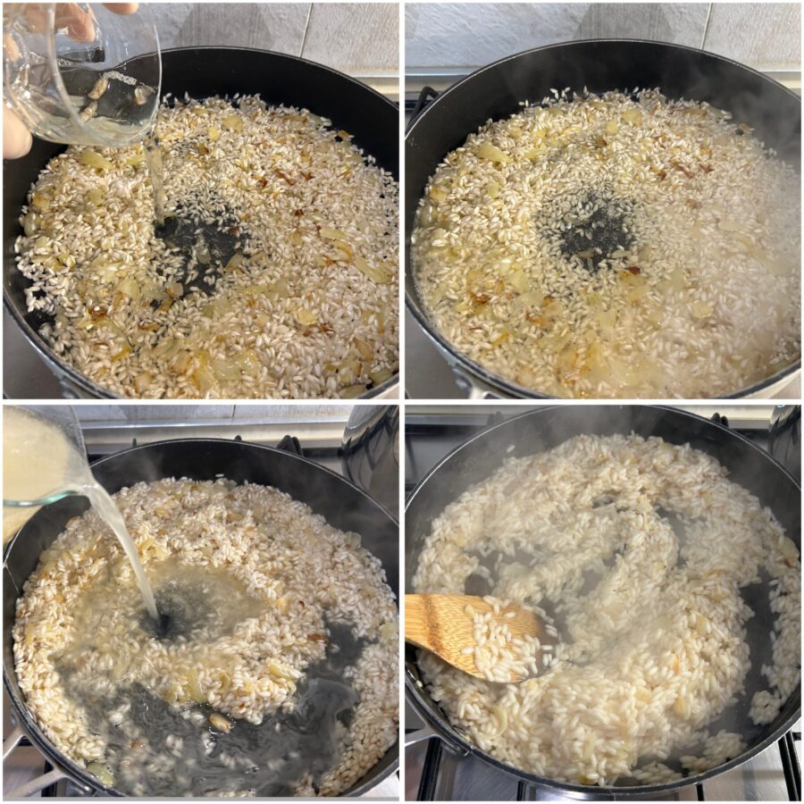 Comece o cozimento adicionando o caldo quente aos poucos; continue por cerca de 15–18 minutos, mexendo frequentemente e acrescentando caldo conforme necessário.