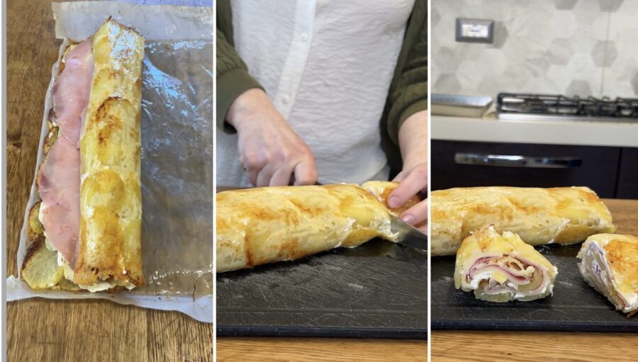 Rocambole de batatas fatiadas recheado com presunto e queijo, sem ovos. Entre todas as melhores receitas com batatas, com certeza este rocambole de batatas fatiadas merece um lugar de destaque. Já fizemos muitos rocamboles de batata, do Rocambole frio de batatas ao Rocambole de batatas com massa folhada, passando pelo Rocambole de batatas com speck e queijo assado e por este recheado com presunto e queijo, mas são sempre receitas que pedem batatas amassadas e ovos na massa. Esta receita, em vez disso, prevê que as batatas sejam usadas em fatias e que fiquem unidas entre si graças à crostinha dourada e saborosa proporcionada pelo queijo que é espalhado na assadeira antes de dispor as batatas. Trata-se de uma receita para o jantar bem econômica e rápida, que vai agradar tanto adultos quanto crianças: querem experimentar também? Vamos pra cozinha então — este rocambole de batatas sem ovos vai te apaixonar na primeira mordida gostosa, mas antes de começar lembro que, se quiser ficar por dentro das novas receitas, pode seguir minha página Facebook e meu perfil Instagram.
