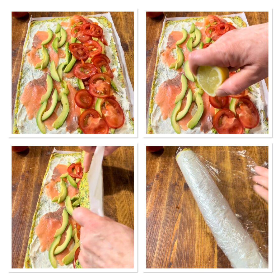 Rocambole de omelete de abobrinha assado no forno, com Philadelphia, salmão defumado, tomate e abacate. Rolos de abobrinha recheados com salmão defumado e cream cheese, super fáceis e rápidos. Esses saborosos rolinhos de omelete de abobrinha sem glúten assados no forno, com recheio de cream cheese (Philadelphia) e salão defumado, abacate e tomates, são ideais para um almoço ou jantar leve e saboroso, para servir como prato principal frio ou como entrada. A receita é bem simples: trata-se de uma clássica omelete de abobrinha ao forno com ovos, abobrinhas cruas raladas e bem espremidas e parmesão, que você pode personalizar como preferir. Eu recheei com salão defumado, Philadelphia, abacate e tomates e aromatizei tudo com um pouco de raspa e suco de limão. Essa receita, além de ser sem glúten, é também leve, e o salmão pode ser substituído por speck, presunto, salame, ou, em uma versão vegetariana, pode ser recheada só com queijo e legumes.