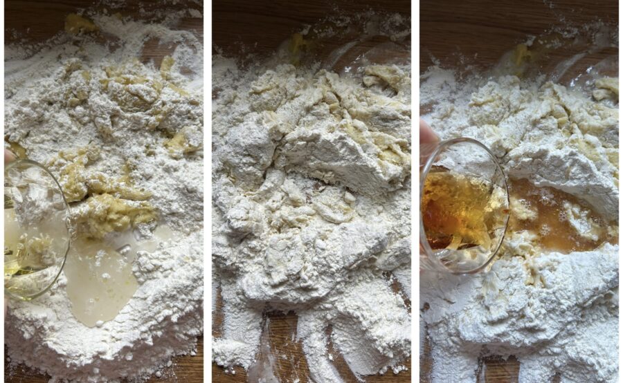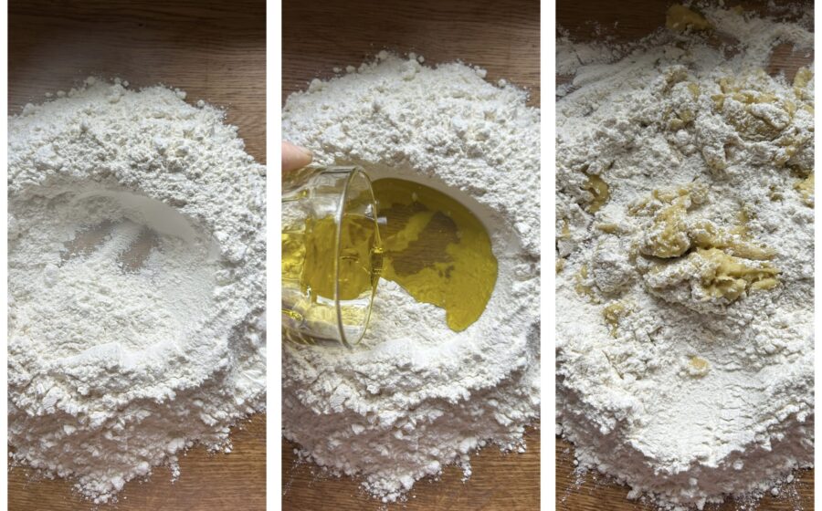 Coloque a farinha sobre a bancada formando uma cova, junte o azeite, misture,
