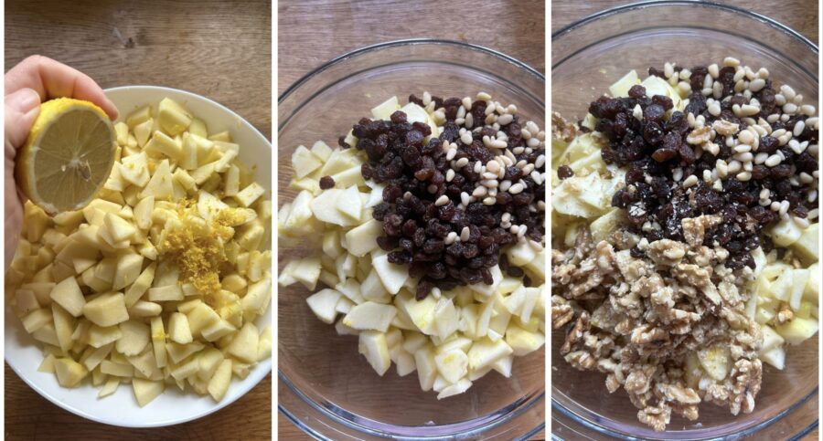 • Corte cada gomo em pedaços pequenos, juntando-os em uma tigela grande. Adicione o suco e as raspas raladas do limão, os pinhões, as passas (eu não reidrato), os miolos de nozes grosseiramente picados (você pode acrescentar também algumas amêndoas),