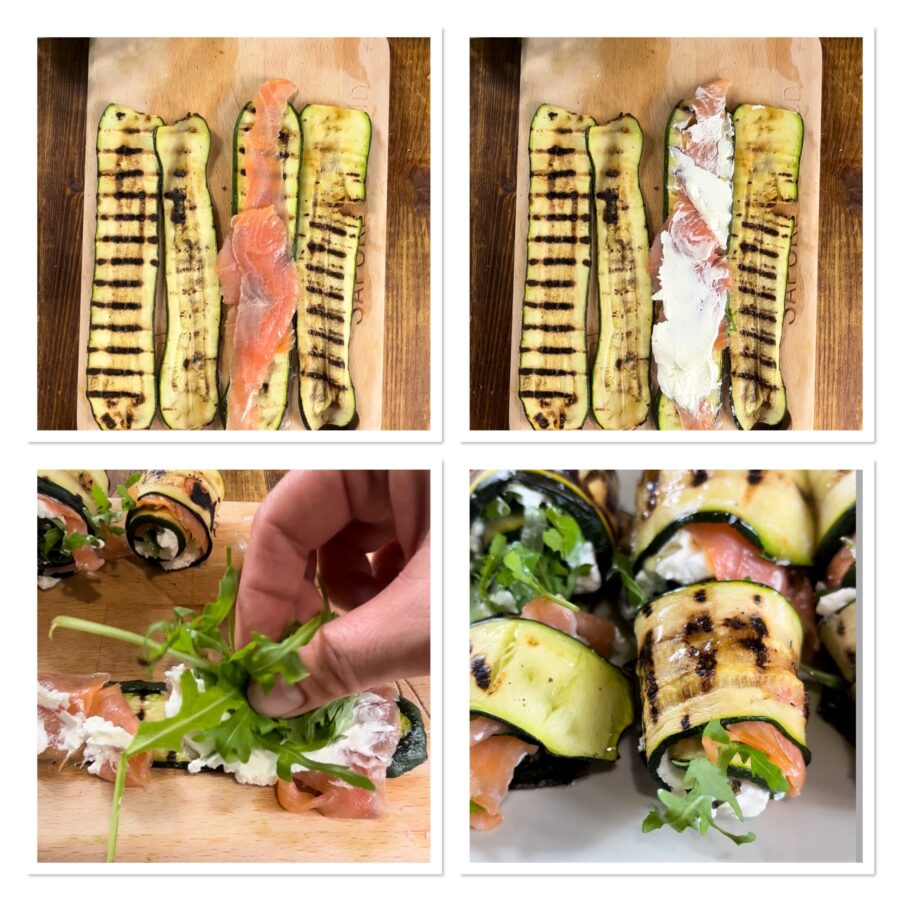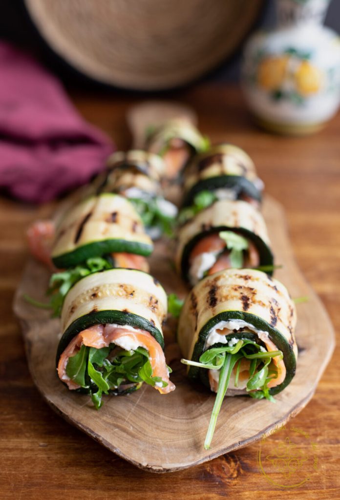 Rolinhos de abobrinha grelhada recheados com salmão defumado, robiola e rúcula, uma entrada fácil, leve e saborosa, perfeita do Natal ao Ferragosto e um segundo prato leve delicioso.