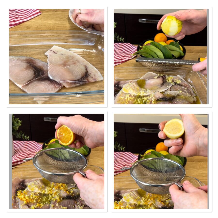 • Peça ao seu peixeiro de confiança para cortar fatias bem fininhas de peixe-espada; eu costumo comprar já prontas, embaladas a vácuo e congeladas no supermercado. Coloque as fatias (descongeladas) em uma assadeira e deixe marinar por 10 minutos com azeite, o suco de uma laranja, o suco de meio limão e as raspas raladas dos dois cítricos.