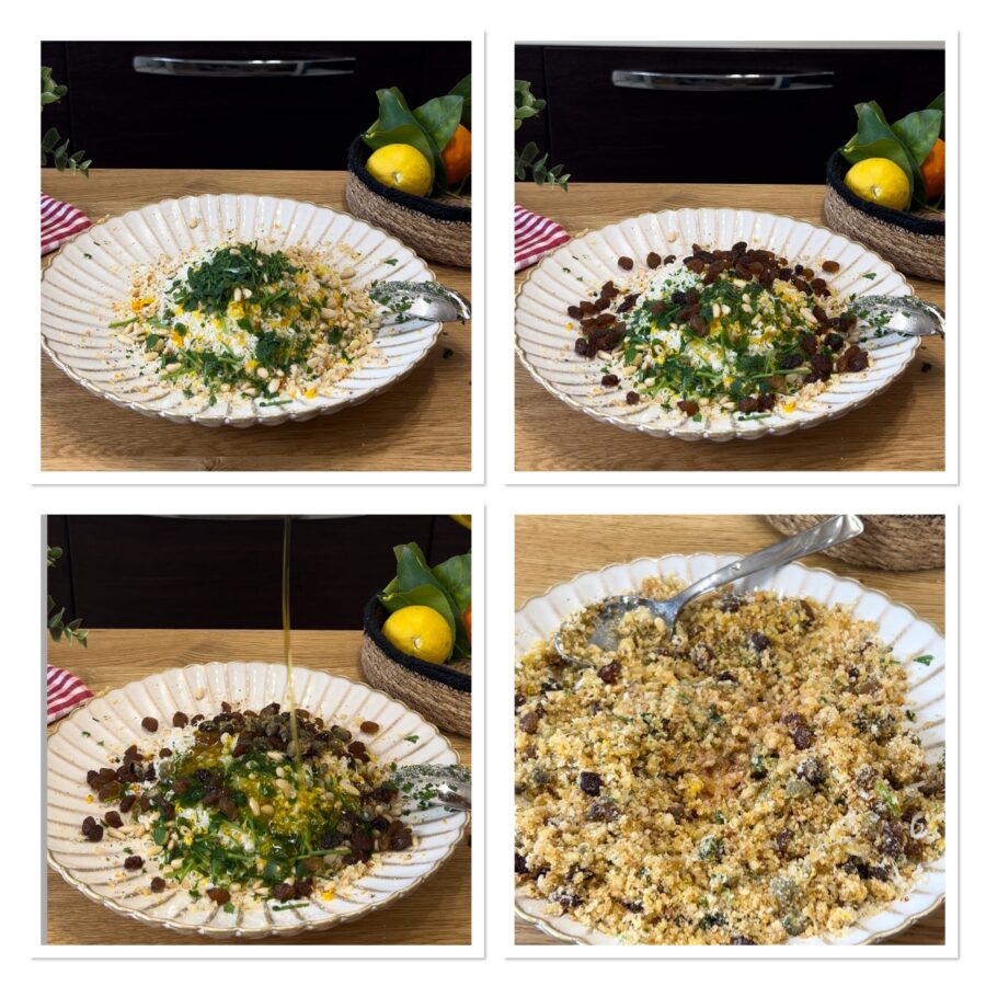 • Prepare o recheio dos rolinhos, misturando a farinha de rosca e o queijo ralado que sobraram, as raspas de meio limão e meia laranja raladas. Junte também a uva passa, as alcaparras dessalgadas picadas, os pinhões, um generoso fio de azeite, 2-3 colheres de suco de laranja e uma de limão. Misture bem; no final você deve obter uma consistência parecida com areia molhada — se ficar muito seco, junte um pouco de água ou suco de laranja.