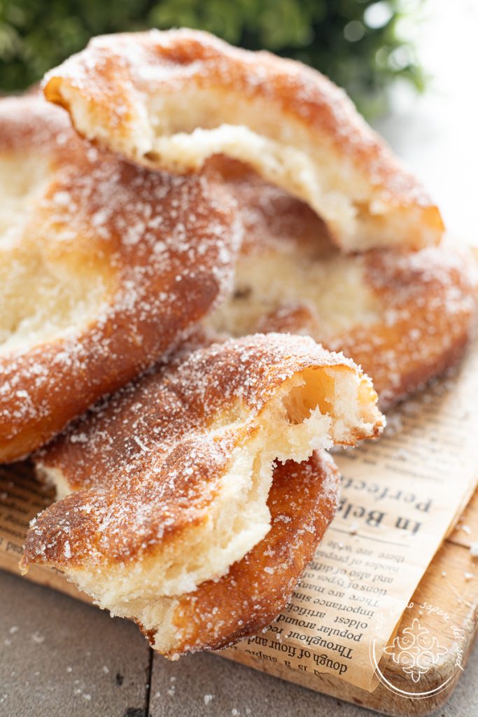Rosquinhas do parque de diversões, a receita da vovó para rosquinhas fofinhas e deliciosas cobertas de açúcar, tão boas quanto a mais tradicional massa de pão frita siciliana, perfeitas também como doces de Carnaval junto com as chiacchiere. Vou ser sincera, eu nunca vi essas rosquinhas num parque de diversões, mas aqui na Sicília estamos cheios de festas patronais e feiras onde elas são um must, então pedi a receita a uma amiga que prepara e vende rosquinhas deliciosas! Se forem Zeppole sardas ou Zeppole de arroz de Catânia, ou ainda as rosquinhas de maçã super rápidas ou as rosquinhas doces, rápidas e super macias, quando meus filhos sentem cheiro de fritura, açúcar e baunilha, piram de alegria!