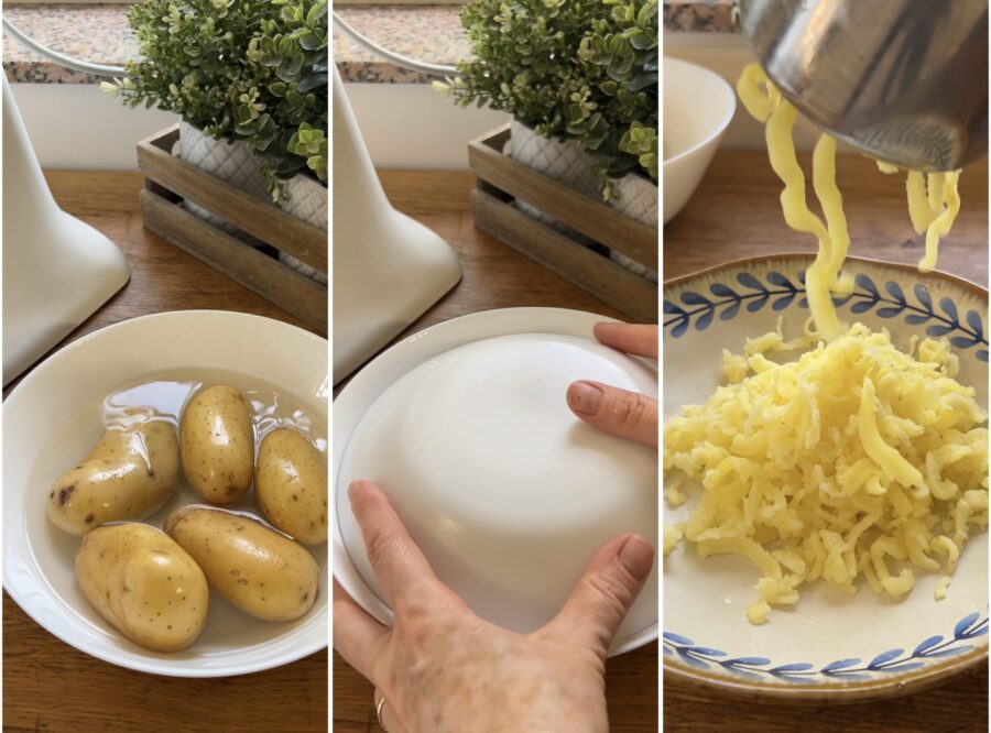 Para preparar nosso polpettone de atum, lave as batatas, coloque-as numa panela, cubra com água, salgue e leve ao fogo. Cozinhe por cerca de 35–40 minutos e, para checar o ponto, espete com um palito: se estiverem macias, desligue. Ou faça como eu: após lavar, coloque as batatas em uma tigela, junte meio copo de água e cubra bem com filme plástico. Cozinhe no micro-ondas a 750W por 20 minutos, retire e deixe amornar. Amasse as batatas depois de descascá-las manualmente ou usando um espremedor de batatas.