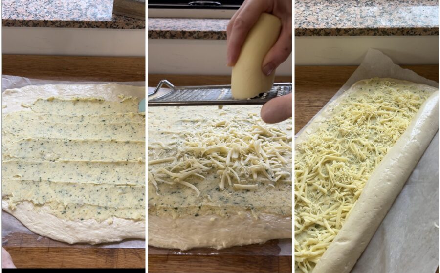 e espalhe o recheio de batatas por toda a superfície, deixando alguns centímetros livres na borda para fechar os rolos. Salpique queijo de massa filada ou provolone ralado com um ralador de furos largos.