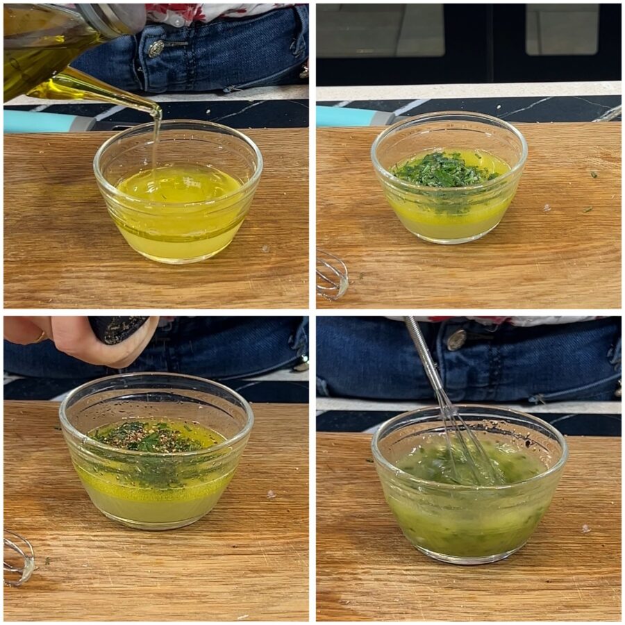 Enquanto isso, prepare uma emulsão misturando azeite extravirgem, suco de limão, salsinha picada e uma pitada de pimenta. Bata bem com um garfo até obter um molho perfumado e bem homogêneo.