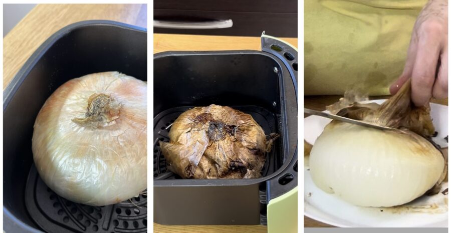 Eu assei 1 cebola de 1 kg por 90 minutos na airfryer a 200°C; no forno os tempos podem ser um pouco mais longos. Para avaliar o cozimento, espete com um garfo e, se estiver macia, estará pronta.
