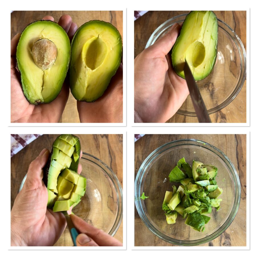 Corte o abacate ao meio, retire o caroço e faça cortes na polpa em sentido vertical e horizontal. Com a ajuda de uma colher, retire a polpa, coloque numa tigela e tempere com sal, azeite e suco de limão.