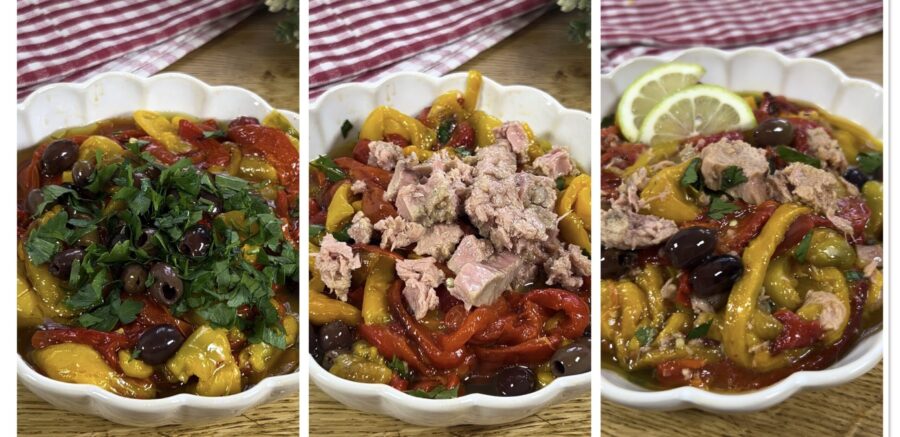 Salada de pimentões assados, atum e azeitonas, a salada fresca, leve e saborosa perfeita para o verão. Você já conferiu nossa seleção dedicada aos 10 melhores contornos com pimentões e com certeza já amou a clássica e atemporal Salada de pimentões assados à siciliana. Certamente as receitas fáceis com pimentões são muitas, desde os pratos principais com pimentões até os segundos como os rocamboles de pimentões à siciliana gratinados. Basta ter este maravilhoso legume de verão na geladeira para preparar algo gostoso. Desta vez, com os pimentões assados no forno pensei em preparar uma salada leve, fresca, cheia de sabor e perfeita para os dias mais quentes, um prato que você pode preparar de manhã ou à noite e saborear com calma ao voltar da praia, no trabalho ou depois de um dia fora de casa. Prontos para descobrir como fazer a receita da salada de pimentões assados com atum e azeitonas? Vamos para a cozinha, mas como sempre, antes de ligar o fogão, lembro que se quiser ficar por dentro das minhas receitas, pode seguir minha página do Facebook e meu perfil no Instagram.