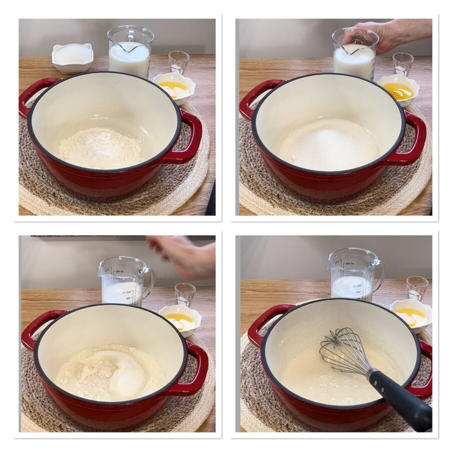 Vamos começar pelo creme. Junte a farinha, o açúcar e a vanilina em uma panela, adicione um pouco de leite e mexa para dissolver tudo.