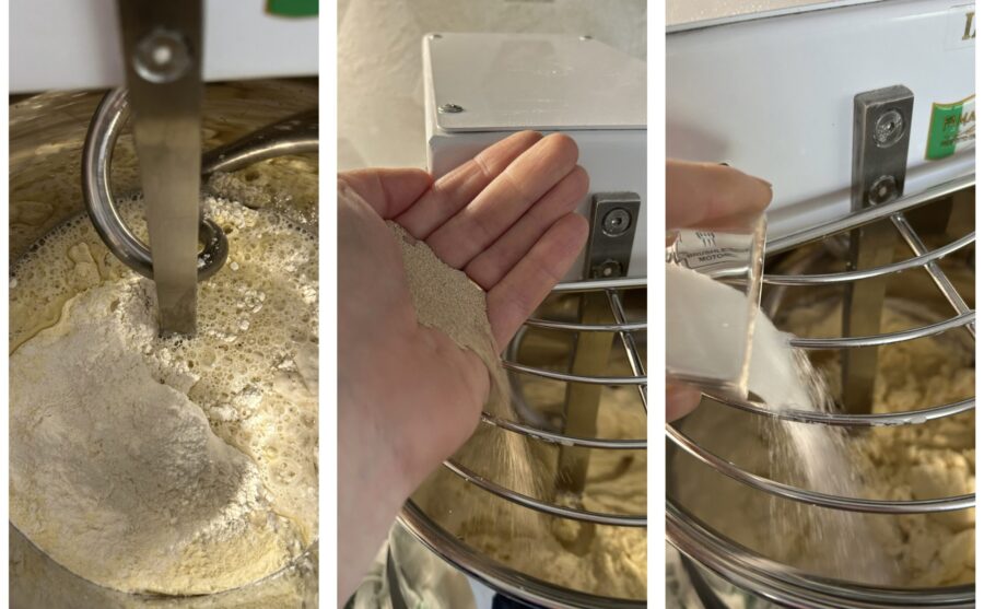 Bati a massa do sfincione bagherese na batedeira, mas você pode usar da mesma forma a planetária. A massa também pode ser trabalhada à mão, mas nesse caso remeto você ao procedimento do sfincione palermitano clássico (link acima). A massa do sfincione é bem hidratada, porque ao final do cozimento você deve obter “uma esponja”; trabalhar com batedeira ou planetária vai te dar uma ótima incorporação e vai exigir menos esforço.