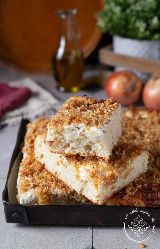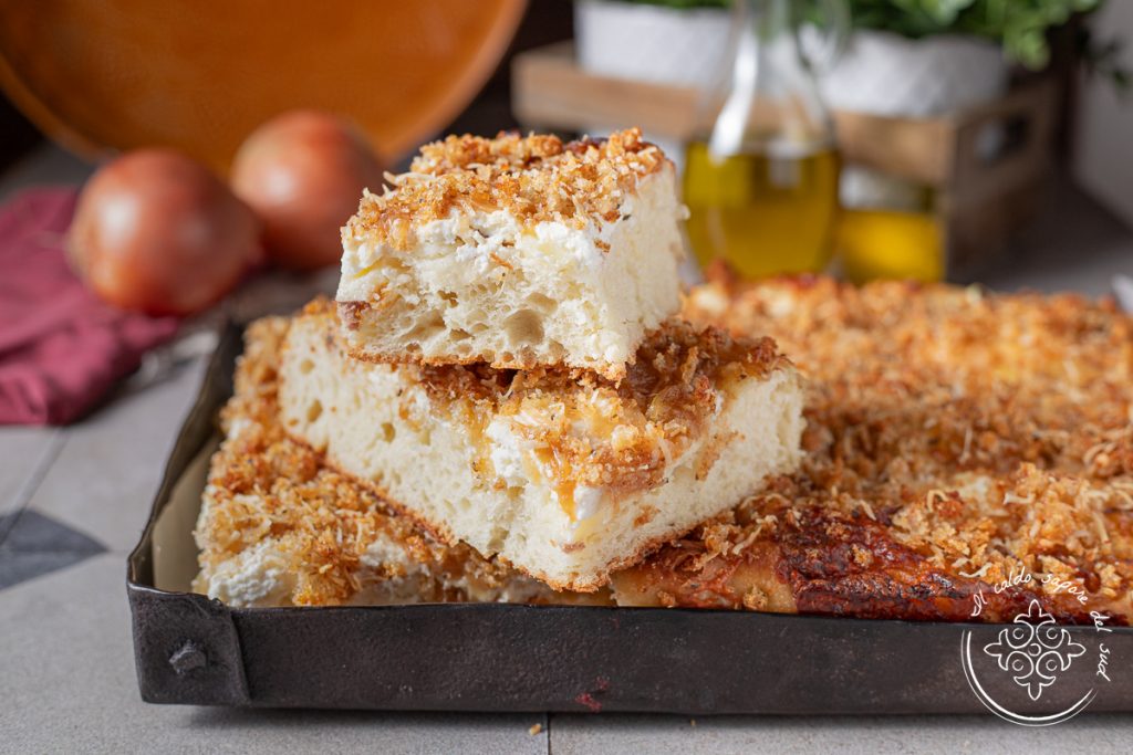 finalize com a camada de ricota de ovelha, deixada a escorrer no dia anterior. Cubra com as cebolas estufadas, distribuindo bem por cima, e misture o caciocavallo às migalhas.