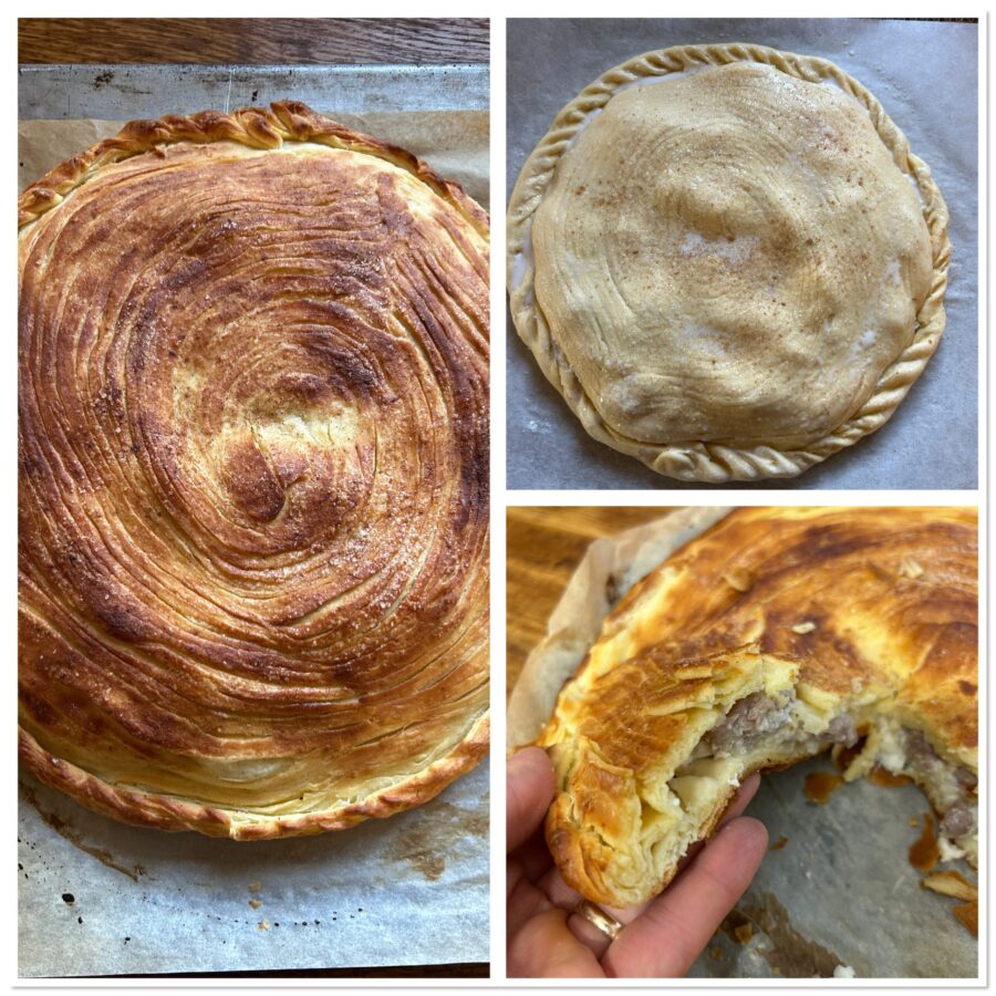 Partindo do centro para fora, abra delicadamente o primeiro disco, usando um pouco de farinha se precisar. Com a parte “folhada” virada para cima, coloque o disco sobre uma assadeira forrada com papel manteiga e recheie com a ricota, uma pitada de pimenta-do-reino e manjerona (eu, pessoalmente, não uso), sal se necessário e a linguiça esfarelada e sem tripa (que já é bem salgada). Abra o segundo disco e use-o para cobrir o recheio.