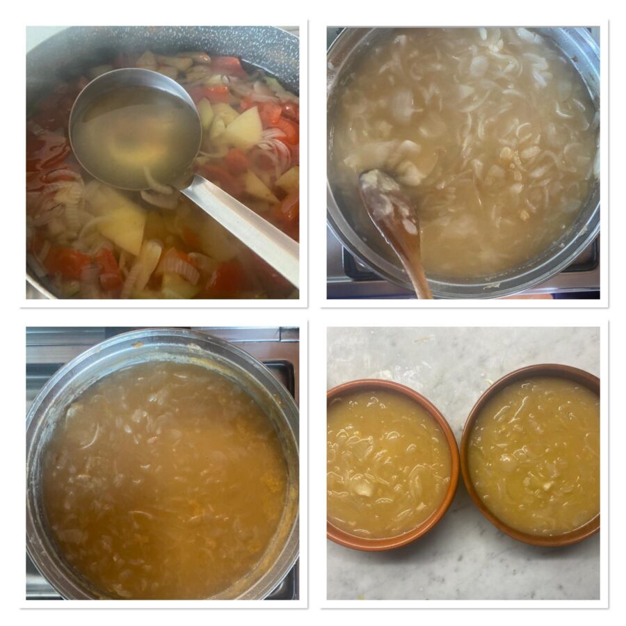 (Eu preparei um caldo de legumes fervendo por 45 minutos 1,5 litros de água com uma cebola, uma abobrinha, uma cenoura, uma batata e um tomate, ajustando o sal. Você pode substituir o caldo de legumes por caldo de boi, adicionando também carne ao que foi indicado acima, mas prolongando o cozimento por pelo menos 2h e 30 minutos).