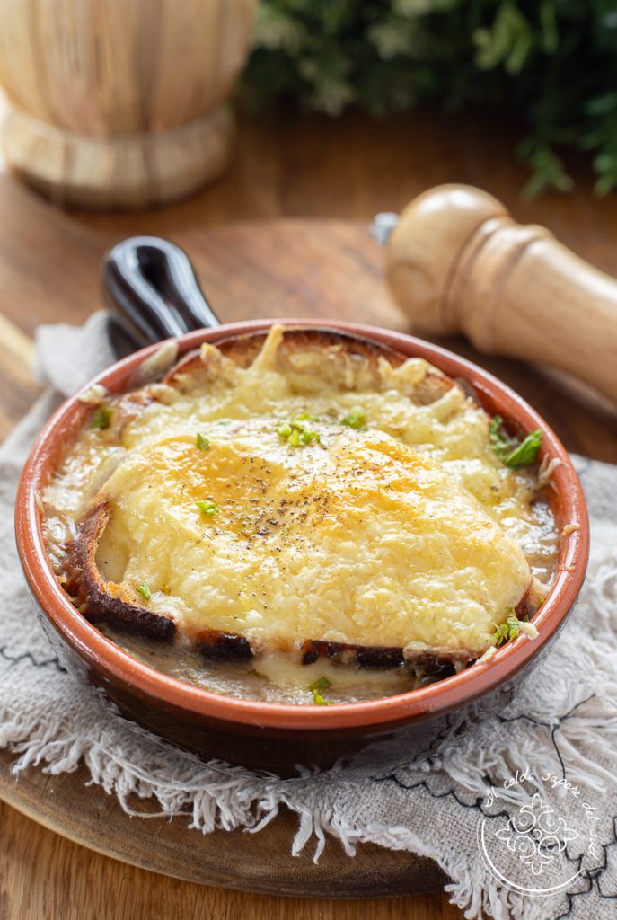 A Sopa de cebolas brancas à francesa é um prato humilde e delicioso à base de cebolas, caldo de legumes ou de carne, pão rústico e gruyère! Hoje na França a “soupe à l’oignon” é um prato refinado e servido nos restaurantes mais chiques e elegantes, mas a sopa de cebola tem origem na pobreza de antigamente, quando com poucas coisas se criavam pratos de sabor excepcional. A sopa de cebolas brancas é uma receita da vovó, cremosa, acolhedora, saborosa e delicada — é um verdadeiro comfort food para saborear numa noite fria de inverno e um agrado delicioso para se permitir com frequência. A sopa de cebola original é preparada com caldo de boi; eu, porém, fiz uma sopa de cebola com caldo de legumes, uma versão vegetariana igualmente gostosa. Este prato saboroso e de sabor intenso é realmente maravilhoso, assim como todas as receitas nas quais a cebola é protagonista, por exemplo a Genovese napoletana, o ragù branco com cebolas ou o Rustico de massa folhada com cebolas! Querem experimentar a receita da sopa de cebola? Tenho certeza de que, com seu sabor característico e encorpado, sua gratinação e as fatias de pão rústico embebidas, ela vai fazê‑los apaixonar!