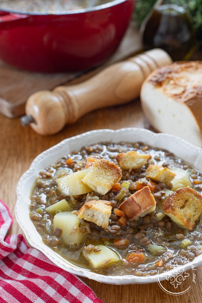 Sopa de lentilhas e batatas receita da vovó — mas mais que uma sopa, uma canja cremosa de lentilhas e batatas com cenouras, a que vamos acrescentar muitos crostinhos de pão aromatizados, feitos com o Pão de massa dura que preparo sempre. A receita da sopa cremosa de batatas e lentilhas é vegetariana e vegana, adequada para todos, fácil, nutritiva e rica — igual à receita da Sopa de feijão e batatas ou à de grão-de-bico. A cozinha mediterrânea é cheia de pratos veganos saborosos e muitas vezes não percebemos: os exemplos são muitos, da Caponata de berinjelas à siciliana à mais tradicional Sopa de massa e grão-de-bico, até a pizza na sua forma mais simples, a Pizza Margherita, sem falar nas infinitas versões e nas receitas de pão caseiro. Hoje, para continuar nossa viagem pelas receitas vegetarianas da cozinha mediterrânea, vamos preparar a sopa de lentilhas e batatas, receita rápida e simples da minha avó, feita com um bom Caldo de legumes e perfeita para levar à mesa um prato único saudável, rico em fibras e muito nutritivo. Prontos para ir à cozinha? Vamos descobrir como fazer a sopa da vovó de lentilhas, com batatas, cenoura, aipo e cebola — e antes de ir para a cozinha, lembro que se quiser ficar atualizado sobre todas as minhas receitas pode seguir minha página no Facebook (aqui) e meu perfil no Instagram (aqui).