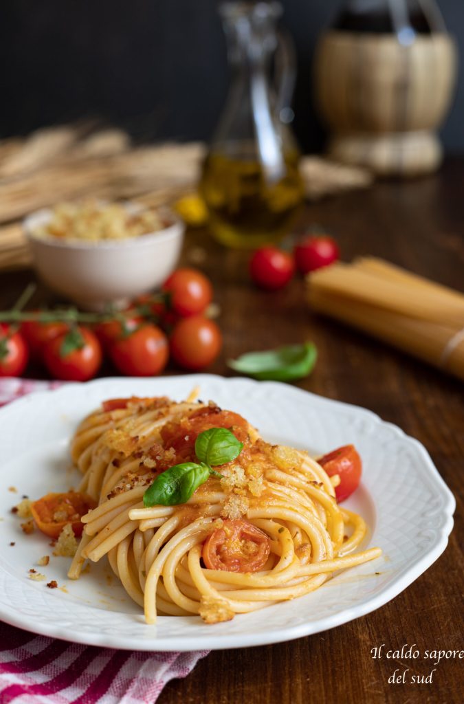 Quando a massa estiver cozida, escorra-a al dente, junte-a aos tomatinhos junto com um pouco da água do cozimento, envolva bem e, quando no fundo da frigideira se formar uma creminha deliciosa, sirva e polvilhe com as migalhas de pão tostadas.