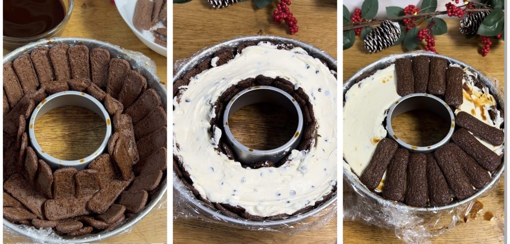 • Preencha a forma já forrada com biscoitos com o creme de mascarpone, nivele bem, bata levemente para eliminar possíveis bolhas de ar e cubra com outros Pavesini de cacau dispostos em leque.