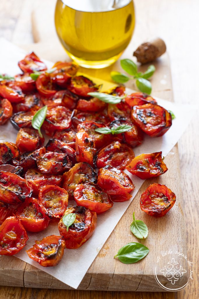 Quando tiverem reduzido para cerca de 1/3 do volume original, permanecendo macios e levemente “dourados” na superfície, estarão prontos. Deixe esfriar e sirva depois de finalizar com manjericão fresco (se tiver tempo, deixe os tomatinhos repousarem por algumas horas: ficam ainda mais gostosos).