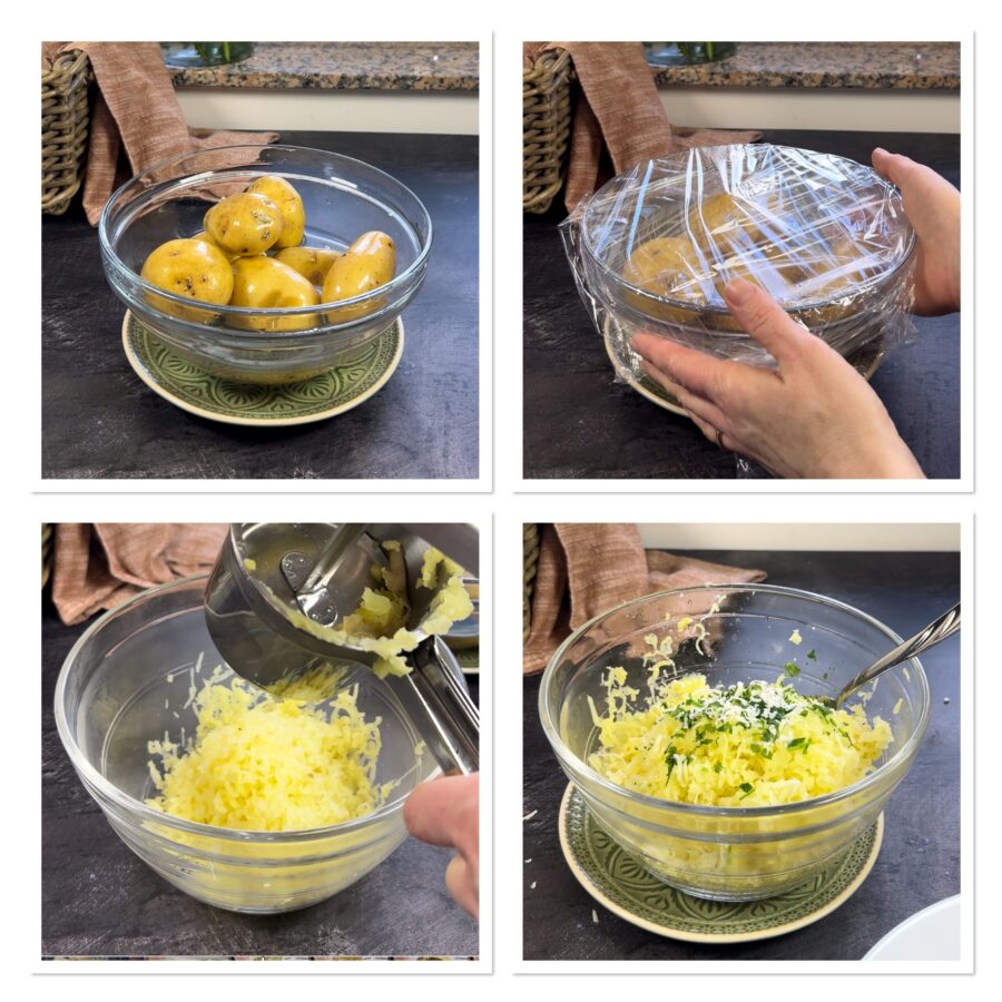 Coloque as batatas numa panela, cubra com água, adicione sal e cozinhe por 35-40 minutos a partir da fervura ou até que, ao espetar com um palito, estejam macias. Escorra e deixe esfriar delicadamente em temperatura ambiente. Ou faça como eu: coloque-as numa tigela depois de lavá-las, acrescente meia xícara de água e cubra hermeticamente com filme plástico. Cozinhe no micro-ondas a 750W por 20 minutos, então retire, deixe amornar alguns minutos e amasse com um espremedor de batatas.