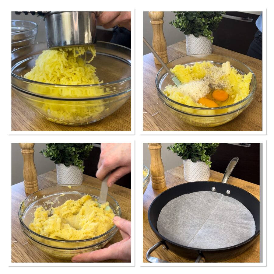 • Coloque as batatas amassadas em uma tigela, junte sal, pimenta, os ovos e o queijo ralado. Misture bem a massa e forre o fundo da frigideira (escolha uma de fundo grosso) com papel-manteiga.