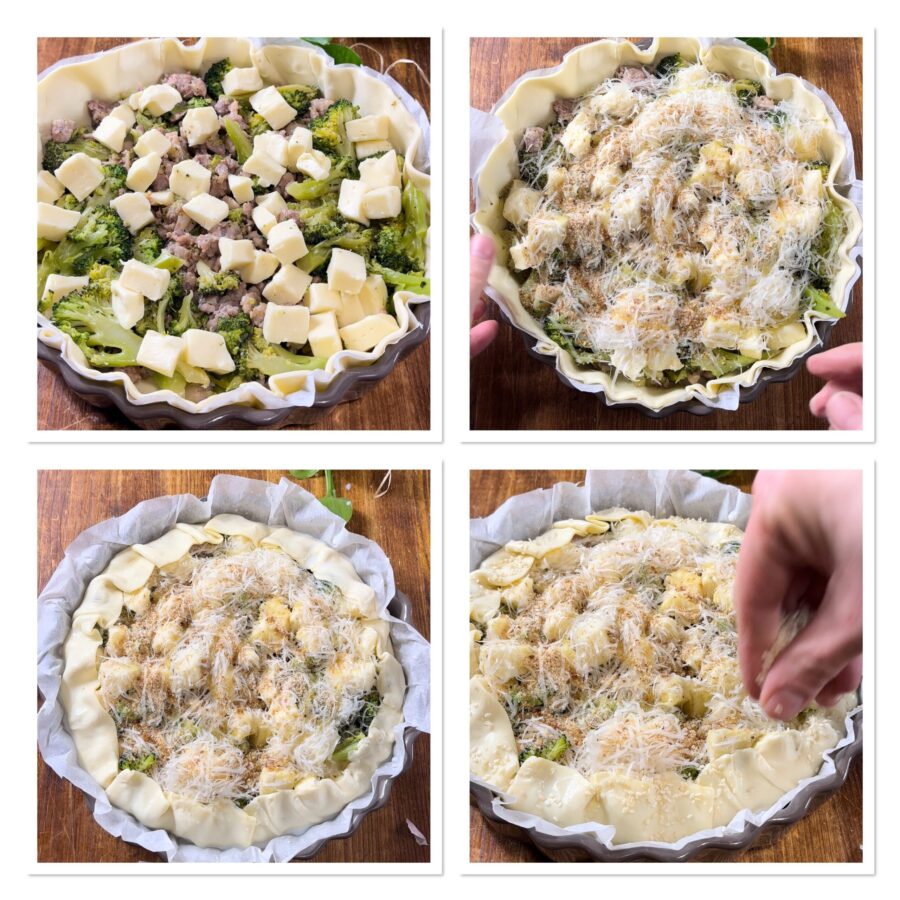 Recheie com os brócolis e a linguiça já em temperatura ambiente, junte os cubos de queijo, o queijo ralado, uma colher de farinha de rosca e regue com um fio de azeite.