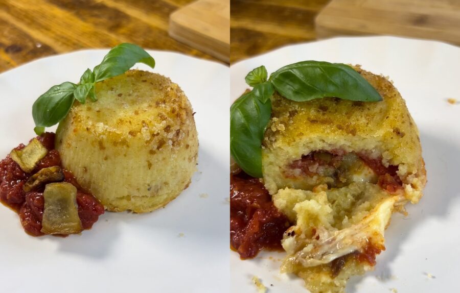 Tortinhas de batata com berinjela frita e coração cremoso. Das tortinhas de batata já fizemos muitas versões, lembra por exemplo as tortinhas de batata com brócolis ou as tortinhas de batata com espinafre? Sem falar das tortinhas de batata com mortadela e queijo e das com cogumelos, todas com certeza deliciosas. Hoje quero propor uma versão de verão com berinjela frita, parmesão e queijo — aqui estão as tortinhas de batata à parmegiana! Essas tortinhas gostosas são super fáceis de fazer e muito saborosas; podem ser um aperitivo caprichado, um acompanhamento ou até um segundo prato vegetariano delicioso. Você pode prepará-las com antecedência e servir em temperatura ambiente, ou montar e assar antes de ir à mesa — de qualquer forma ficarão deliciosas. Quer experimentar também? Vamos para a cozinha e descobrir juntos como fazer as tortinhas de batata com berinjela. Antes de correr para o fogão, lembro que, se quiser ficar atualizado com todas as minhas receitas, pode seguir minha página no Facebook (aqui) e meu perfil no Instagram (aqui) e que neste especial você encontrará muitas receitas rápidas com berinjela, todas ótimas.
