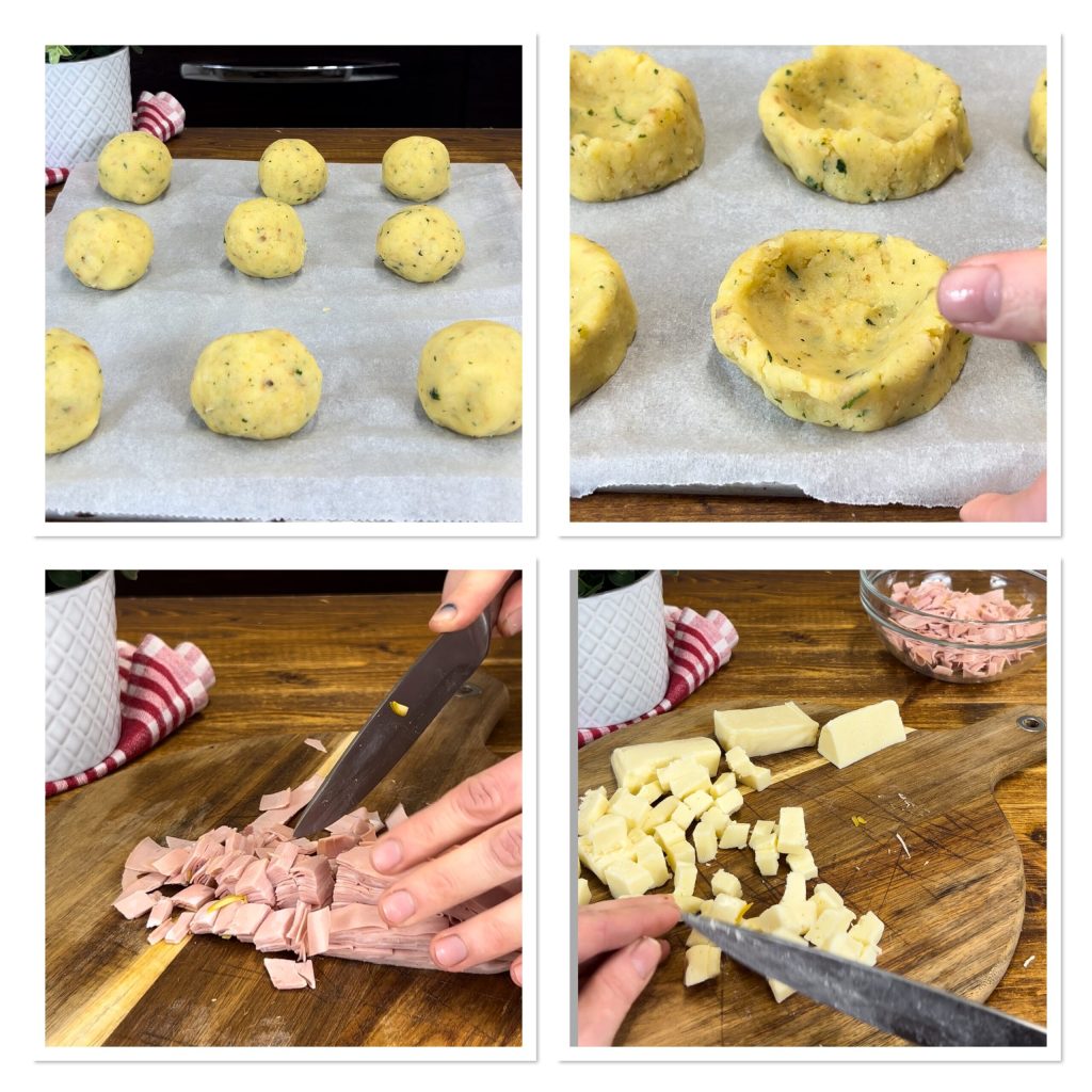 Modele as bolinhas, fazendo um rebaixamento que possa conter o recheio. Para o recheio, corte a mortadela em pedacinhos bem pequenos e corte o queijo em cubinhos.