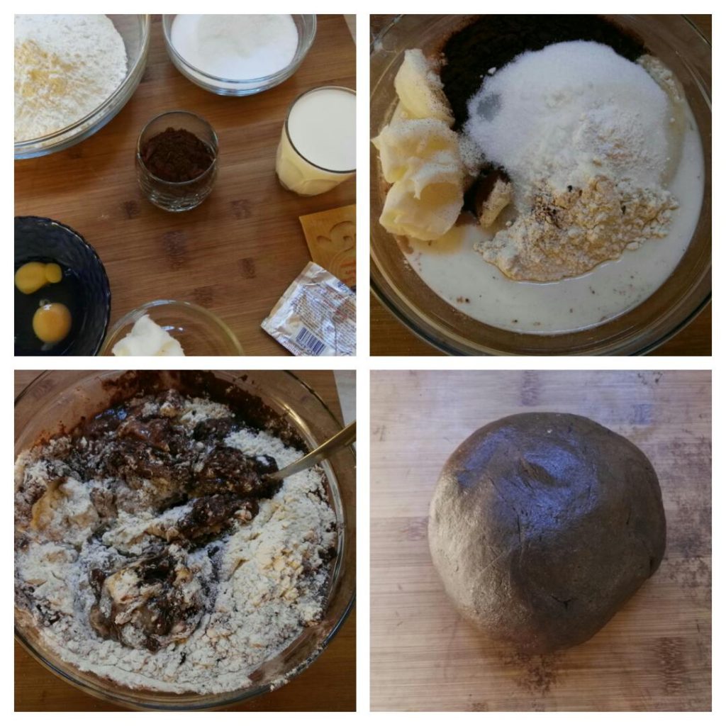Pegue uma tigela grande e coloque a farinha, a banha, os ovos, as raspas de limão, o cacau, o açúcar, a baunilha, a amônia e o leite — este último acrescente aos poucos enquanto amassa para regular a consistência da massa, que deverá ficar manejável mas bem macia.