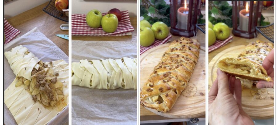 A trança de massa folhada com maçã é uma sobremesa com maçã fácil e rápida, bem gostosa e tão boa quanto as Frittelle di mele ou a Torta tutta mele. É uma sobremesa inspirada no Strudel de maçã, mas mais simples tanto no recheio quanto na base feita com massa folhada, então é prática, perfeita também para quem tem menos intimidade com a cozinha. Em você leva à mesa a sua trança de maçã com massa folhada, pronta para ser saboreada quente, morna ou em temperatura ambiente. O acabamento trançado também deixa a sobremesa refinada e elegante, permitindo que você faça bonito à mesa com pouquíssimo esforço! Eu enriqueci minha trança de massa folhada com maçã e canela com pinhões, mas, se quiser, você pode substituí-los por lascas de amêndoa ou outra oleaginosa e acrescentar pedaços de chocolate amargo ou passas. Sirva este bolo morno acompanhado de uma porção de creme de confeiteiro ou de sorvete de creme e verá que espetáculo, mas essa sobremesa também pode ser apreciada fria e fica ótima até no dia seguinte. Vamos para a cozinha agora, mas antes de ver nossa receita com massa folhada e maçã, convido você a dar uma olhada no meu especial dedicado a Sobremesas com maçã: todas as receitas e lembro que, se quiser ficar por dentro de todas as minhas receitas, pode seguir minha página no Facebook (aqui) e meu perfil no Instagram (aqui).