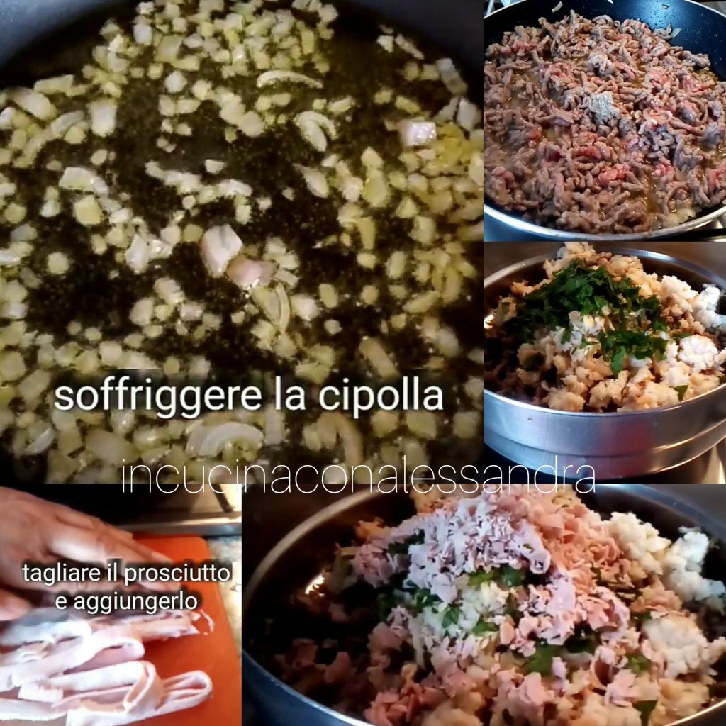 • Refogue a cebola e adicione a carne moída, cozinhe por 12/15 minutos, uma vez cozida deixe esfriar um pouco. Enquanto isso, molhe o pão com água, deve amolecer, depois esprema bem para tirar o excesso de água. Em uma tigela, coloque a carne e o pão espremido, adicione a salsinha picada, o presunto cortado em pedaços pequenos e o ovo, misture bem ajustando o sal.