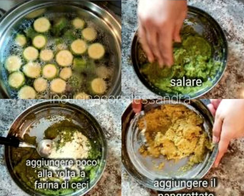 Primeiro lave bem as abobrinhas. Corte em rodelas, pegue uma panela, encha com água e coloque as abobrinhas; quando começar a ferver, cozinhe por 6/7 minutos. Escorra bem e bata com um mixer de imersão. Em uma frigideira, refogue um pouco de cebola picada em óleo. Tempere as abobrinhas com sal, adicione a cebola refogada e vá acrescentando aos poucos, sempre mexendo, a farinha de grão-de-bico, até obter uma consistência bem firme — faça o teste para ver se dá para formar o burger. Nesse ponto, acrescente uma pitada de cúrcuma e uma colher de sopa de farinha de rosca, misturando bem.