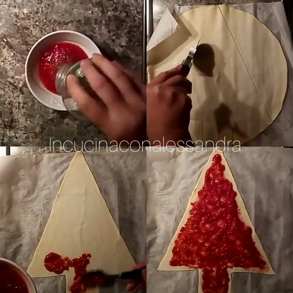Estenda a massa folhada deixando-a com o seu papel manteiga, com uma faca corte a massa em forma de árvore. Com uma colher espalhe o purê de tomate temperado com sal e orégano. Coloque as fatias de presunto cozido e cubra com a outra massa, cortando-a como a de baixo. Sele bem as bordas com um garfo. Pincele com ovo batido e decore com as azeitonas e os tomatinhos.