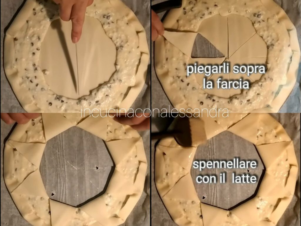 Em uma tigela, coloque o açúcar, a ricota, o ovo, a vanilina e as raspas de uma laranja, misture bem até que se torne um creme homogêneo, depois adicione as gotas de chocolate amargo mexendo. Pegue uma forma redonda e estenda a massa brisée, comece a rechear a partir do lado externo deixando alguns centímetros, recheie cerca de 5 centímetros indo em direção ao centro.