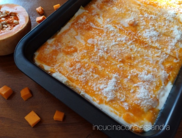 A lasanha de abóbora com bechamel é um prato principal de outono, inverno. Ótimo para preparar para um almoço ou jantar em família. A preparação é muito simples, semelhante à das lasanhas clássicas com a diferença de que, em vez do ragù de carne, acrescentei a abóbora, e não é necessário escaldar as folhas de massa, eu as uso sem cozinhar, pois uso tanto o bechamel quanto a abóbora bem quentes, para que a massa amoleça um pouco. É uma receita mais leve, mas saborosa, também adequada para vegetarianos. A lasanha de abóbora é um prato principal delicioso ao qual ninguém poderá resistir!!!