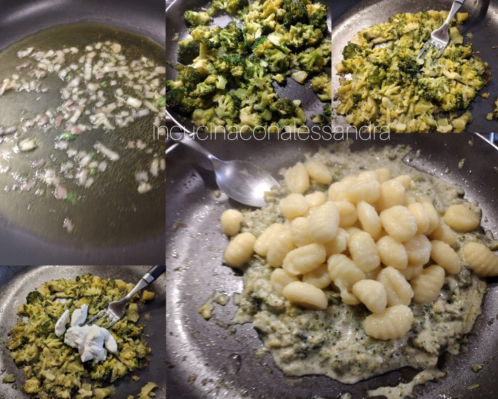 Primeiro de tudo, você deve limpar e lavar bem os brócolis, cortar em pedacinhos inclusive os talos, pelo menos eu coloco, gosto muito. Picar a cebola roxa finamente, em uma frigideira coloque um fio de azeite, adicione a cebola picada e deixe refogar, neste ponto coloque os brócolis e deixe dourar por 1 minuto junto com a cebola, depois adicione um pouco de água, salgue, misture e continue cozinhando com uma tampa em fogo baixo. Enquanto isso, coloque a água no fogo para os nhoques. Quando os brócolis estiverem cozidos, amasse-os com um garfo, jogue os nhoques na água, despeje o creme de leite vegetal na frigideira com os brócolis e cozinhe por 1 minuto, mexendo bem. Escorra os nhoques e coloque-os na frigideira com os brócolis e o creme e deixe saltear por alguns minutos para dar sabor. Polvilhe com o queijo parmesão ralado e sirva bem quente. Eu não coloquei, mas você pode também deixar alguns pedaços de brócolis para colocar por cima dos nhoques.