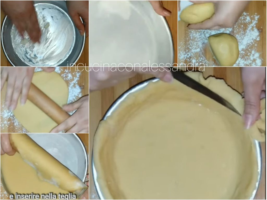 Despejar o recheio nivelando bem. Estender a massa frolla restante e com uma rodinha cortar as tiras e decorar o bolo, assar no forno quente e cozinhar a 180°C por cerca de 50/60 minutos, deve ficar bem dourada. Quando estiver fria, polvilhar com açúcar de confeiteiro.