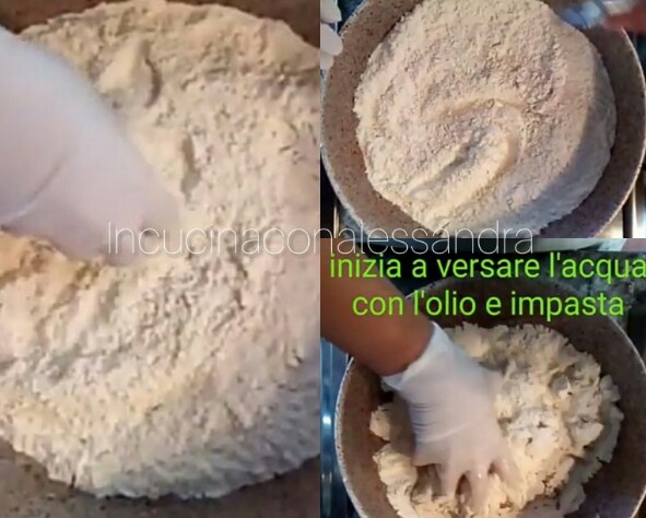 Coloque a farinha em forma de vulcão em uma tigela, adicione sal, açúcar e o fermento, comece a misturar adicionando a água com o azeite, continue amassando adicionando a água.