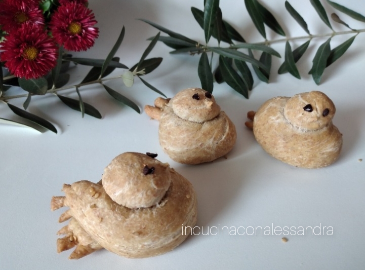 Uma vez que a massa está pronta e levedada, corte um pedaço de massa e faça um rolinho redondo, corte pequenos pedaços e forme bolinhas que formarão a cabeça, naturalmente o tamanho você decide de acordo com o que mais gostar, eu fiz do tamanho de um pãozinho normal. Faça outro rolinho redondo, corte um pedaço de cerca de 10/12 centímetros, coloque sobre o papel manteiga, pegue as duas extremidades e cruze-as deixando-as para fora, com uma faca faça 2 cortes em cada extremidade, formaremos a cauda, pegue as bolinhas preparadas e coloque sobre o buraco que se forma ao cruzar a massa, com os dedos tente formar um pequeno bico, pegue as azeitonas e corte em pedacinhos pequenos, pincele com um pouco de leite ou óleo a superfície das pombinhas, cubra com sementes de gergelim, pegue 2 pedacinhos de azeitona e faça os olhos pressionando um pouco para não cair. Deixe levedar por meia hora e asse no forno quente a 180° e cozinhe por 10/15 minutos. Sirva as pombinhas em um prato para cada convidado.