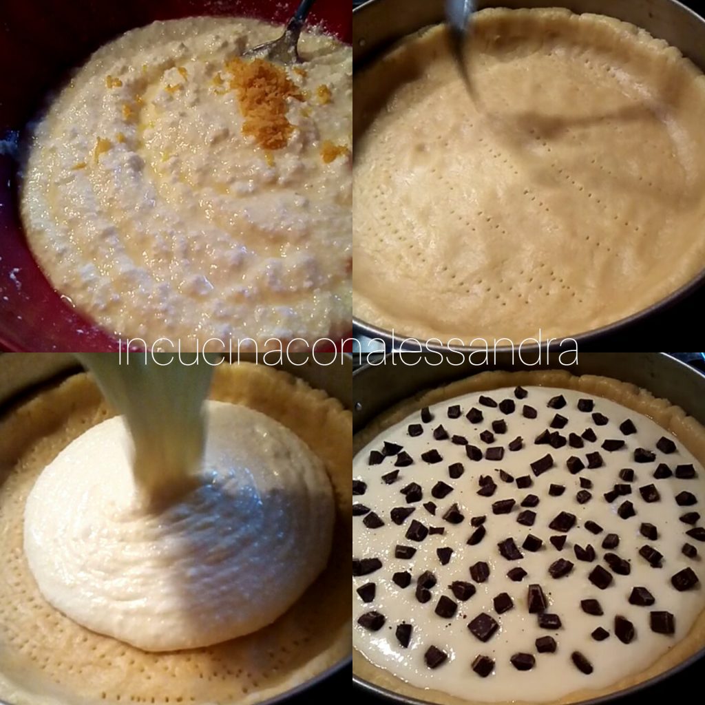 Primeiro, prepare a massa folhada e deixe descansar por meia hora. Enquanto isso, em uma tigela, coloque a ricota e o açúcar, mexa bem, adicione os ovos e as raspas de limão, sempre mexendo bem. Pegue uma forma, unte e enfarinhe, pegue a massa folhada, corte uma porção e reserve, estenda a massa na forma, cerca de meio centímetro de espessura também para as bordas e as bordas com pelo menos dois centímetros de altura. Faça furos com um garfo, despeje o creme sobre a massa, adicione as gotas de chocolate por cima. Pegue a massa restante, estenda e faça as decorações que preferir. Asse a 180° por cerca de 30/35 minutos.