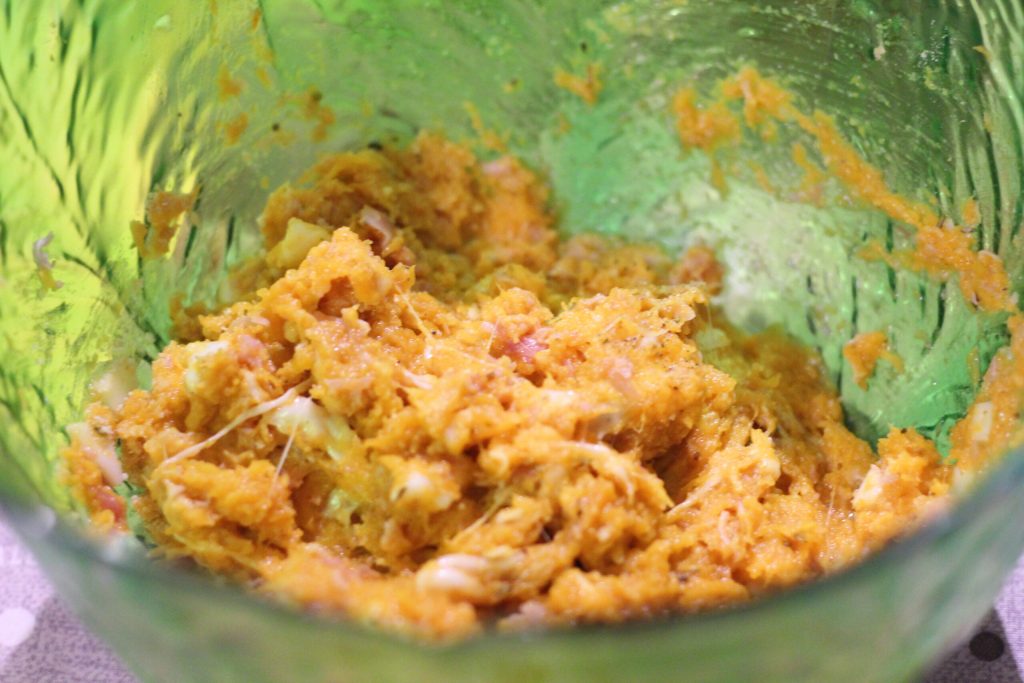 Passos para preparar as almôndegas de abóbora, provolone e presunto