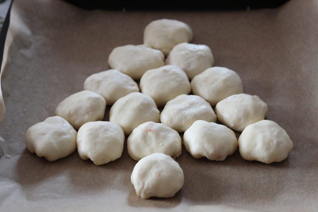 Agora pegue uma assadeira forrada com papel manteiga e coloque as bolinhas de pizza de forma a formar uma árvore de Natal, bem próximas, uma em cima, depois duas, embaixo três e assim por diante. Enquanto isso, pré-aqueça o forno estático a 220 graus e asse a base de pizza por 15 minutos.