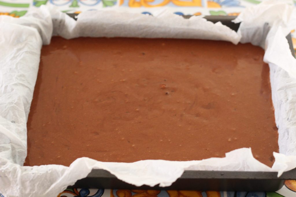 • Enquanto isso, pré-aqueça o forno estático a 180 graus. Pegue uma assadeira forrada com papel manteiga, eu usei uma assadeira de 28×23, e despeje a mistura dentro. Se você perceber que o papel manteiga está com dificuldade de permanecer na assadeira, recomendo molhá-lo com água e depois espremer bem. Eu sempre faço assim. Asse os brownies por cerca de 20 minutos. Sempre faça o teste do palito para ver se estão cozidos. O interior, no entanto, deve permanecer macio.