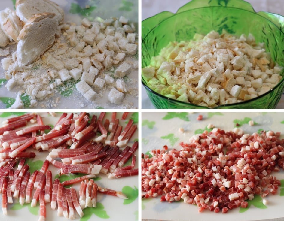 • Para preparar os canederli tiroleses, a primeira coisa a fazer é cortar o pão amanhecido em pequenos pedaços. Quanto menores, melhor se amalgamarão. Coloque-os em uma tigela grande e, enquanto isso, aqueça o leite integral. Quando estiver quente, adicione-o ao pão amanhecido e deixe de molho por 15 minutos. Enquanto isso, corte o speck em tiras finas. Em seguida, corte as tiras de speck em pequenos cubinhos.